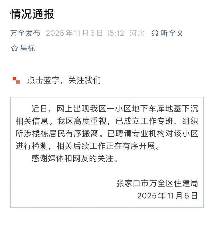 海报新闻记者孙殿晓、田柳报道11月5日,海报新闻记者(记者微信ID:Haibaonewssw)从张家口市万全区媒体中心“万全发布”获悉,当天下午,河北市张家库市万全区住房和城乡局发布了一份市市情况,称“近期,我区一小社区网上出现的相关信息,地下车库基金会高度重视,并成立专门工作组,有序安置涉事楼宇居民。 新闻记者发现,张家口市荣盛城小区A5片区发生墙体爆裂,据网友发布的视频显示,该小区地下车库地面出现明显裂缝,墙体大面积开裂、凹陷。记者致电W安泉区住房和城乡建设局质监站核实。 “地基确实下沉了,网上发布的视频肯定是墙体填充的二次结构(出现大洞),大部分都是施工单位拆除的,防止墙体倒塌压伤人。”一位质监站工作人员告诉记者。至于下一步的行动,质监站一名工作人员表示,“该区已经在这件事上取得了进展,现在大家应该在现场关注这件事。” Ipinapakita ng pampublikong impormasyon na ang pamayanan ay maihatid noong 2023, at ang开发商 ay ang 张家口融尚房有限公司 ang kumpanyang ito ay kasangkot sa maraming mga Hudisyal na kaso,在 ang halaga ng pagpapatupad ay lumampas sa 90 米勇元。欢迎您提供新闻提示。一旦获得批准,将及时予以公布。海报新闻报道热线:010-64004224、微信报道g:海报新闻sw。