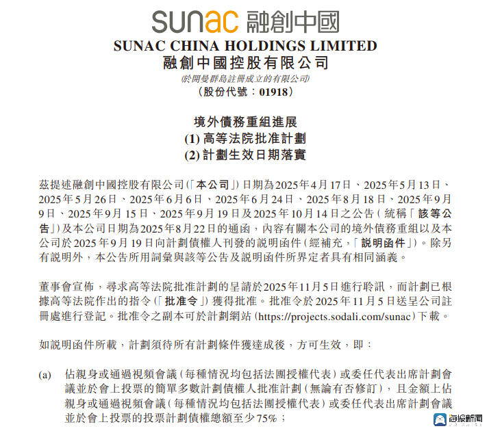 海报新闻记者秦文报道,11月5日,融创中国控股有限公司公告称,约96亿美元海外债务重组获得香港高等法院批准。至此,重组方案条件具备,标志着融创正式成为首家真正明确外债“归零”的大型房地产企业。 11月6日上午,中国指数研究院企业研究部主任刘水在接受海报新闻采访时表示,融创债务重组的完成意义重大。一是债务规模缩小,债务压力明显减轻。香港高等法院的批准标志着第二轮境内外债务重组的完成。本轮债务重组后,整体偿债压力预计将减轻近600亿元,可节省大量资金。f 每年的利息费用。其次,平衡资产负债表符合可持续经营。债务规模大幅缩减,资产拥有率大幅下降,资产负债表也进行了调整,与公司可持续经营相一致。融创境外债权人集体入股,“保交割”仍是融创的首要任务。事实上,早在2023年,融创牵头完成首轮外债重组,采用“债务+展期”的基本思路,创新性地引入强制债券选项,推出包含新票据、转债、强制可转债、融创服务股在内的可选“菜单”,并得到债权人的支持。在开展本轮境外债务重组时,融创运用创新方案,实现各方互利共赢,努力全面、全面解决债务问题。债务风险。 11月5日,融创中国控股有限公司公告称,约96亿美元海外债务重组获得香港高等法院批准。根据方案,融创推出全额债转股选择,向债权人派发两种新的强制可转债:一种转股价格为6.80港元/股,可在重组生效之日起6个月内转换为股票;另一种转股价格为6.80港元/股,可在重组生效之日起6个月内转换为股票;另一种转股价格为3.85港元/股,重组后18至30个月内可转为namamsshare。重组方案还引入股权结构稳定计划、团队稳定计划等安排,确保公司股权结构和核心团队稳定,坚定各方信心,共同为公司创造长期价值。刘水表示,尽管债务重组取得重大进展,但融创仍面临困境。面临以下主要挑战。一是提升经营绩效。债务清偿解决了“存量”问题,但公司未来的健康发展最终取决于自身的“造血”能力。市场销售的持续复苏是恢复现金流和盈利能力的关键。二是“保交付”工作结束。 “保交付”是融创当前的首要任务,也是检验其经营是否步入正轨的主要指标。公司正在全力完成全年交付目标,预计年底前基本完成全部任务。这项任务的顺利完成,对于恢复市场信心、维护社会稳定具有重要意义。三是销售和楼盘盘活压力。虽然上海、北京等地区的高端项目(如“一号院”系列)销售业绩突出,但相对而言,纽约整体合同销售价值仍面临压力。如何加快处置其他项目,成功盘活剩余存量物业,是融创需要解决的现实问题。融创债务重组为大型房企提供了样本参考。中指研究院跟踪数据显示,截至目前,已有21家房企债务重组重组获批并完成。减债总规模约为1.2万亿元,短期内将大大减轻这些企业偿还公共债务的压力。这些企业的有息负债总额接近2万亿元。他们短期内还款并进入安全期的压力较小。保险公司通过各种方式减少了债务并改善了资产负债表。债务重组及MGA叛乱房地产公司重组获批加快房地产风险化解整体进程。融创作为一家完成境内外全部债务重组的大型房地产企业,为其他房地产企业的债务重组提供了借鉴。比如,它提供了不同的选择,实际上很大程度上降低了债务规模,为行业化解风险提供了范例。目前,部分参保房地产企业面临债务重组困难。首先,市场环境困难。商品房销售大幅下滑,房地产企业回款困难,现金流紧张,偿债基础减弱。虽然房地产价格暴跌,但可用于偿还抵押贷款或处置的房地产价值却下降,使得债务重组变得更加困难。二是债权博弈复杂。债权人(如债券持有人、银行、信托等)有不同的de债务减免比例、还款期限等关键条款难以达成共识。第三,公司有自身的局限性。企业“造血”能力不够,主体信用受损,融资渠道普遍封闭,销售方很难赢得购房者的信任。刘水建议,房地产保险公司仍可从以下几方面寻找成功,推动债务重组进程,改善长期发展条件。首先,设计更加雄心勃勃、更加灵活的重组方案。这是赢得债权人支持的关键。计划应多样化,包括现金回购、债转股、资产抵消、长期延期等选择,以满足不同债权人的需求。关键是要表现出诚实,避免被视为“恶意逃债”。例如,您可以考虑给予剥离部分优质资产作为增信措施。二是积极运用政策工具,寻求专业帮助。房地产企业可以关注,将尝试进入各地房地产融资协调机制的“白名单”,以保证tcry项目的顺利发展,从而间接缓解普遍压力。对于债务结构特别复杂的企业,可以考虑引入资产管理公司(AMC)参与重组,利用其处理不良资产的专业经验,并为可能引入战略投资者创造条件。三是将化解债务与业务根本转型结合起来。必须认识到,债务重组只是解决暂时流动性危机的“输血”,主要解决办法在于恢复自身“造血”能力。要全力确保项目交付,同时解决债务问题,重建市场信心。同时,要结合自身实际,探索向房地产运营服务商、城市更新等符合政策引导的新发展模式转型。