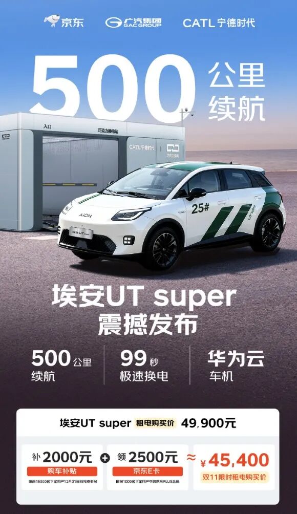 据AION官方微信消息,由京东、广汽、宁德时代联合推出的Aion UT Super售价已正式公布。电池租赁价格为4.99万元。加上plus会员用车补贴和京东e卡补贴,价格可低至4.54万元。此前报道:11月5日,京东、CATL、广汽艾安联合打造的“国民好车”艾安UT超一号在广汽艾安位于长沙的“全球灯塔工厂”下线。值得一提的是,这款车的能量补充方式是可充电、可更换的,这意味着用户在买车时可以购买或租用电池。 “3、2、1!”当天上午9时56分,随着广汽UT车型产品总经理涂旭聪的倒计时,爱安UT超级国民好车一号办公室正式下线。一辆造型时尚、时尚的米色轿车缓缓开走。涂旭聪介绍,艾安UT Super是全球首款电池供电的模型。满足市场需求,标配500公里续航、99秒换电速度。它还保持快速和慢速充电功能。用户实际上可以随心所欲地充电、更换、使用。京东调查数据显示,83%的用户期望价格在10万元以下,94%的用户看重大空间和座椅舒适度,99%的用户将安全性作为主要考虑因素,96%的用户关注续航和能量补充效率。这些见解融入到产品研发和制造中,艾安UT超级产品代理讲师告诉吉木新闻记者,这款车主要有四大颠覆。首先是它的电池寿命长。有了宁德时代升压,电池可租可买,可充电、可更换能源模式,智能便捷。同时,这款车的内部空间也很大。外观像A级车,实际上拥有B级车的空间,轮毂设计为2750mm酶。此外,首创的华为云车载摄像头让汽车变得更加智能,AEB倒车、一体式双门环等技术也提升了汽车的安全性能。在涂旭聪看来,艾安UT Super是京东第一款线上销售的车型,通过电商渠道进行线上专卖的模式对于汽车行业来说是一个很大的变革。 “我们很荣幸走在第一波新浪潮中,我们也期待让买车像买工具一样方便。”艾安UT Super于11月9日正式发售,现已开放预订。极目新闻综合了《第一财经日报》和《极目新闻》此前的报道(记者:刘珊、何佳怡)